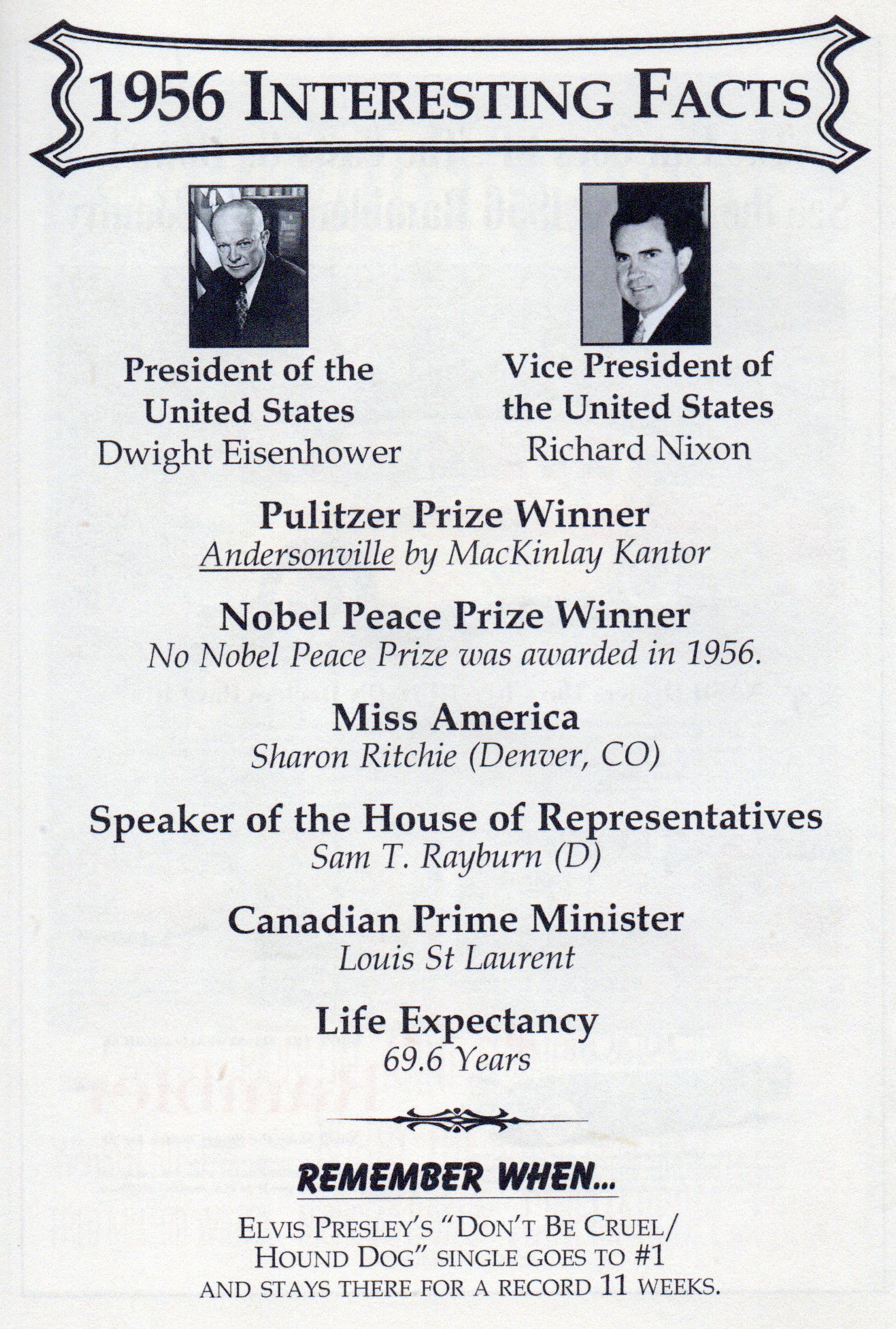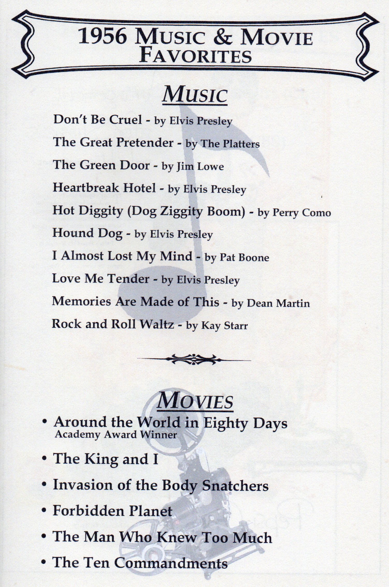 1956 Nostalgia 1956 Top 10 Don't be Cruel - Elvis Presley The Great Pretender - The Platters The Green Door - Jim Lowe Heartbreak Hotel - Elvis Presley Hot Diggity (Dog Ziggity Boom) - Perry Como Hound Dog - Elvis Presley I Almost Lost My Mind - Pat Boone Love Me Tender - Elvis Presley Memories Are Made of This - Dean Martin Rock and Roll Waltz - Kay Starr